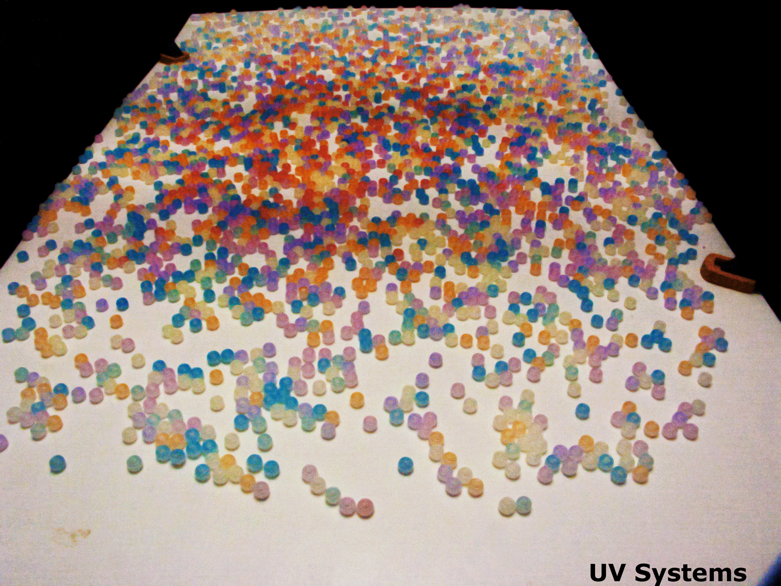 The most intense color is observed after exposure by the UV Systems light. Note how the intensity is strongest in the middle but reaches all the way to the edges. Note the spread of the light held 12" above the beads - this is the beam spread.