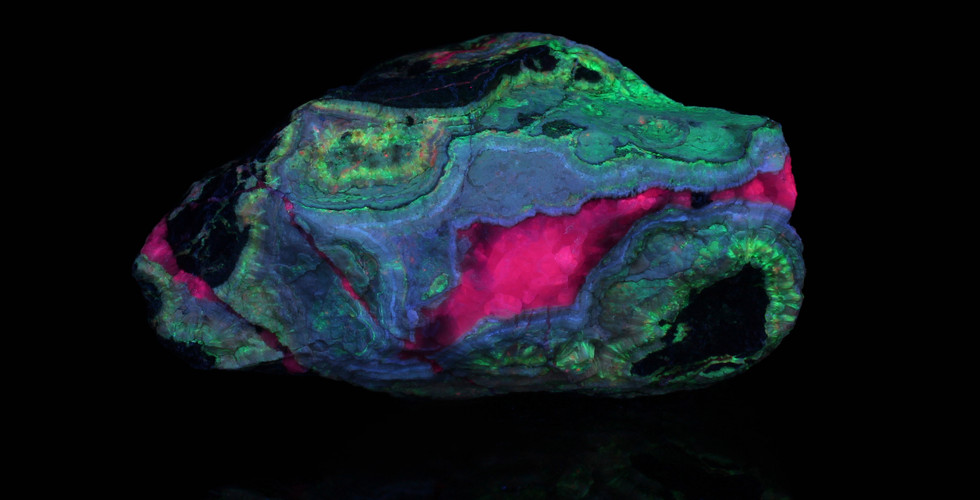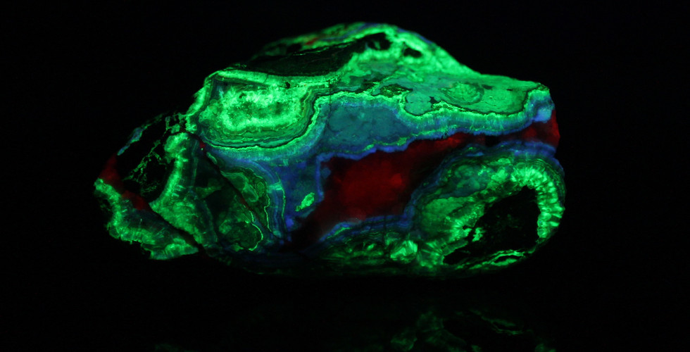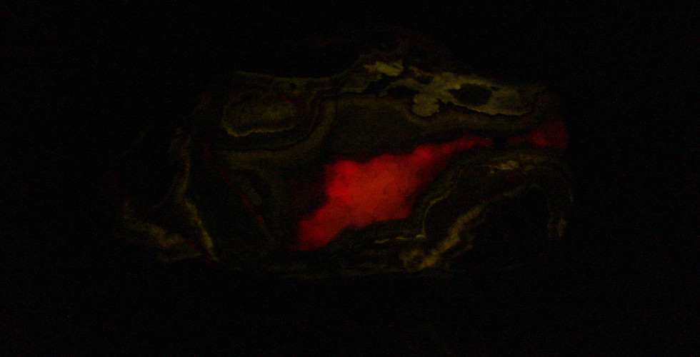 Shown in the slideshow below: Shortwave UV (254 nm tube lamp), Midwave UV (310 nm LED), Longwave UV, SW phosphorescence, MW phosphorescence, LW phosphorescence, Visible light.