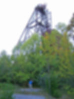 The road leading to the Annabel Lee mine. The mine headframe, seen looming above the treetops, is the only headframe structure remaining intact in the historic Cave-In-Rock mining district. Photo by Chris Clemens.